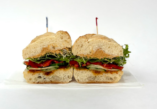 Baguette, Hummus, Sundried Tomatoes, Cucumbers, Sprouts, Red Bell Peppers, Lettuce