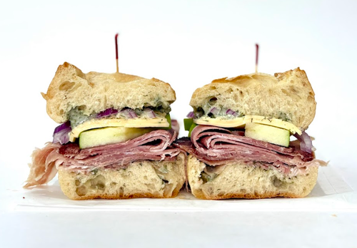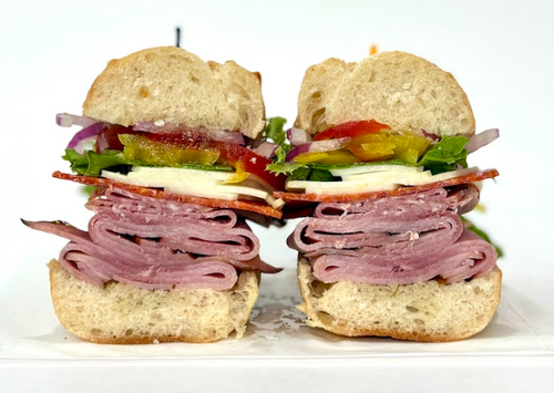 Baguette, Ham, Salami, Pepperoni, Provolone Cheese, Deli Dressing, Banana Peppers, Onion, Lettuce, Tomato