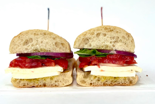 Ciabatta Bread, Fresh Mozzarella, Basil, Tomato, Red Onions, Olive Oil
