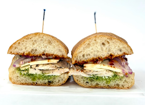 Ciabatta Bread, Grilled Chicken, Provolone Cheese, Basil Pesto, Roasted Tomatoes, Onion