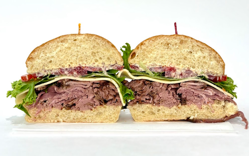 Ciabatta Bread, Rare Roast Beef, Havarti Cheese, Lettuce, Tomato, Creamy Whole Grain Mustard